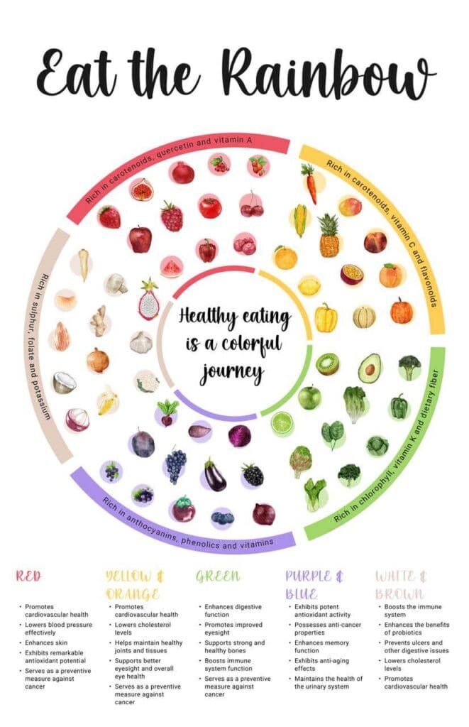 Each color represents a different nutrient profile – vitamins, minerals, and phytonutrients that provide unique health benefits. Here’s a breakdown:
